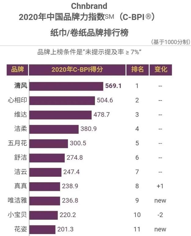 日前,品牌評(píng)級(jí)與品牌顧問(wèn)機(jī)構(gòu)Chnbrand發(fā)布2020年中國(guó)品牌力指數(shù)排行榜,APP(中國(guó))旗下品牌清風(fēng)憑借569.1的C-BPI得分,榮獲2020年C-BPI中國(guó)品牌榜紙巾/卷紙類(lèi)第一品牌*,這已是清風(fēng)第2年榮登榜首。