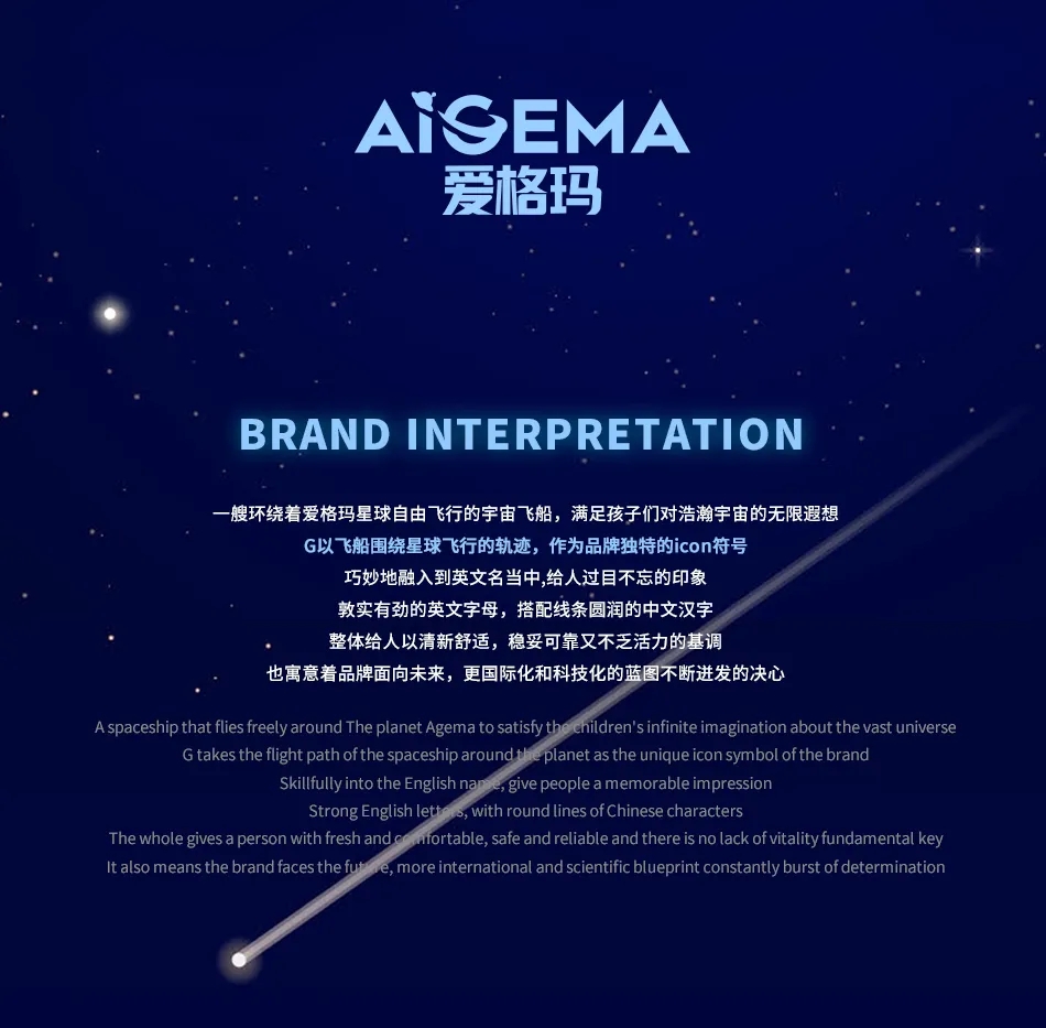 有故事的LOGO,飛船+星軌,小小星夢從此開始。愛格瑪星系宇宙,架構起所有關于愛的哲學的童話意義。簡潔內趣,帶領品牌踏上愛的新征程。