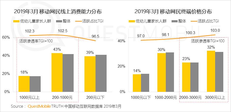 2019年3月移動網(wǎng)民線上消費(fèi)能力數(shù)據(jù)顯示,200-1000元線上消費(fèi)占比43%,1000元以上18%,200元以下39%。但網(wǎng)民終端價格3000元以上占32%,2000-3000元占23%。從中可以看到“低幼兒童家長”人群線上消費(fèi)能力顯著高于整體網(wǎng)民,且使用高價格終端的比例較高,未來兒童消費(fèi)將成為經(jīng)濟(jì)市場一大增長點(diǎn)。