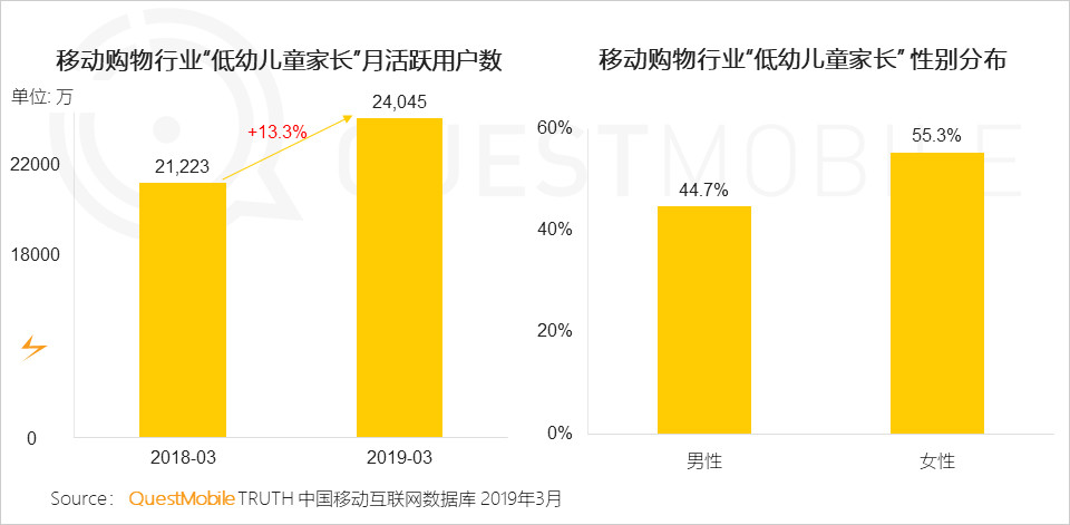 在線消費(fèi)領(lǐng)域,2019年3月網(wǎng)購的“低幼兒童家長”人群同比增長13.3%;其中移動購物行業(yè)”低幼兒童家長“性別分布上來看,男性占44.7%,女性占到55.3%??梢姷?ldquo;寶媽”者得市場,女性的占比顯著高于男性。