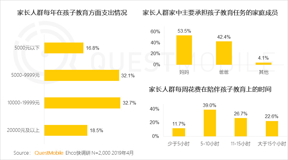 而在家庭人群每年在孩子教育方面支出情況,超八成的家長每年在孩子的教育方面支出均在5000元以上,其中10000-19999元占32.7%,5000-9999元占32.1%。可見人們對于孩子的教育成長真是寄予厚望。而在家長人群中媽媽作為主要承擔(dān)孩子教育任務(wù)占53.5%。從中可以看到在孩子的教育問題上,“媽媽”才是教育決策的主要決策者。而在家長人群每周花費(fèi)在陪伴孩子教育上的時間5-10小時占比最高,達(dá)到39%。