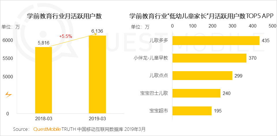 最新數(shù)據(jù)顯示,學(xué)前教育用戶增速明顯高于整體移動網(wǎng)民增長速度,而在線早教憑借技術(shù)的快速發(fā)展深得家長喜愛,在學(xué)前教育行業(yè)”低幼兒童家長“月活躍用戶數(shù)TOP5APP排列依次分別是兒歌多多、小伴龍-兒童早教、兒歌點(diǎn)點(diǎn)、寶寶巴士兒歌、寶寶超市。其中早教APP兒歌多多以435萬排列第一,其次為小伴龍-兒童早教月活躍用戶達(dá)370萬。