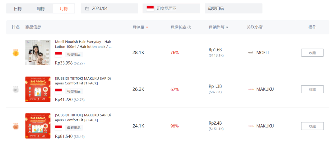 3月- Top1的商品為兒童紙尿褲,月銷量為20.8K,月銷售額為72.6K(美金)月增長(zhǎng)率為-8%,Top2的商品是紙尿褲組合,月銷量為26.2K,銷售額為87.8K(美金)月增長(zhǎng)率為62%,Top3的商品為紙尿褲,月銷量為16.1K,月銷售額為54.4K(美金)月增長(zhǎng)率為347%。