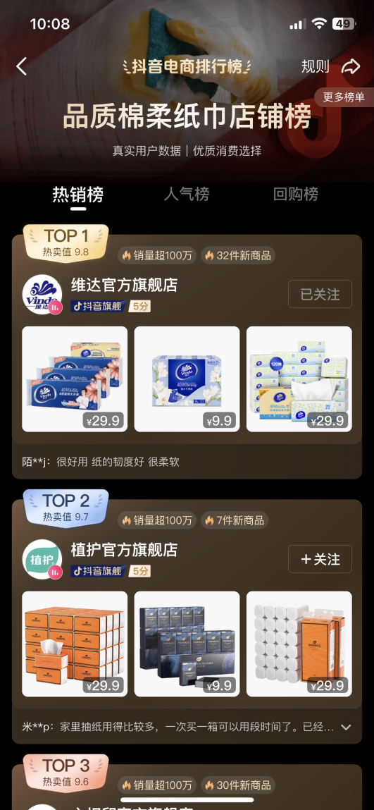 以生活用紙品牌維達為例,截至2023年7月25日,據(jù)抖音平臺直播動態(tài)顯示,維達官方旗艦店今年上半年累計直播場次已超過200場。從最新的抖音電商排行榜來看,維達官方旗艦店已經(jīng)在“品質綿柔紙巾店鋪熱銷榜”上排名第一。而店內(nèi)居銷量榜首的爆品手帕紙更是售出達到253.6萬件。其中排名前五的品類分別為手帕紙、卷芯紙和抽紙,手帕紙獨占前三名。