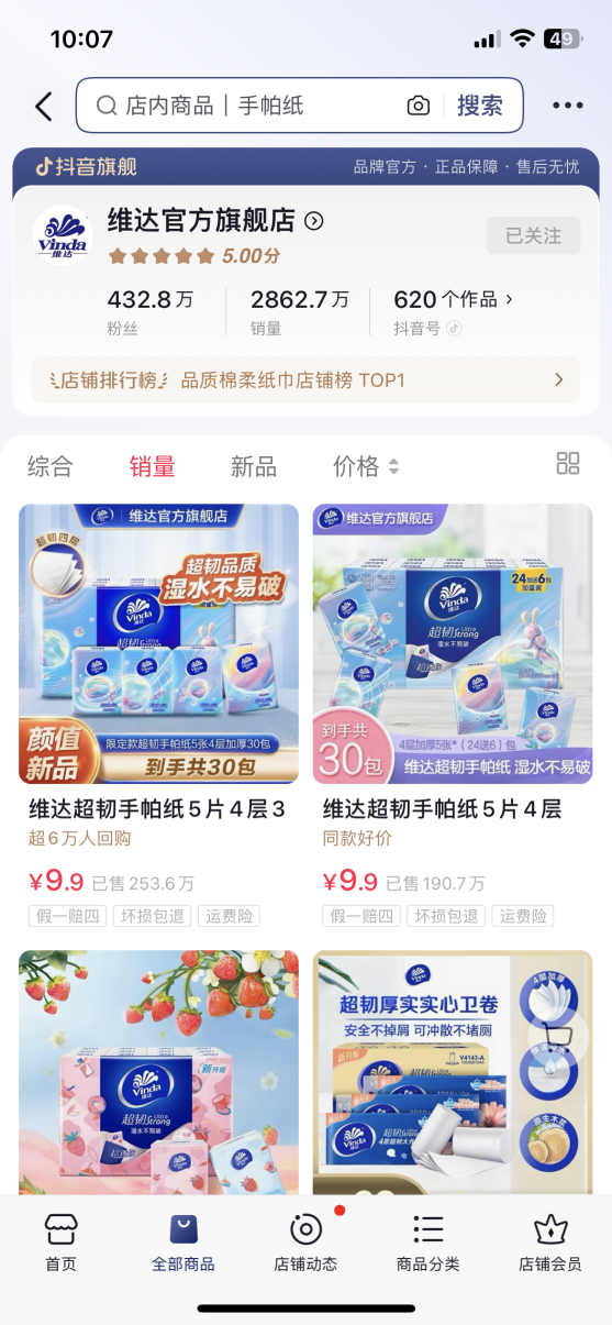 其中以抖音電商為例,維達在抖音設立的旗艦店已經(jīng)擁有粉絲432.8萬,累計獲贊138.5萬,并發(fā)布了620個推廣作品,對應上架商品多達579件。