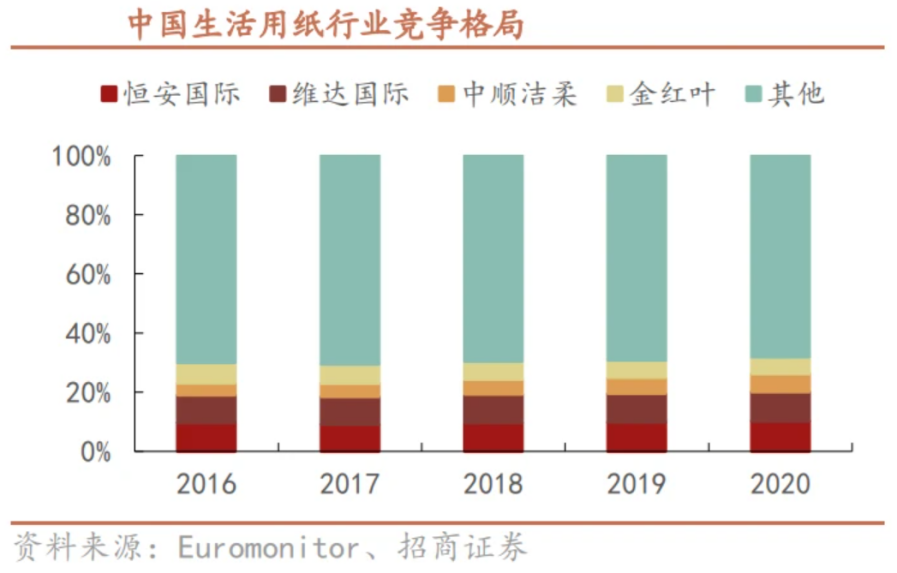 據(jù)招商證券研報顯示,2020 年中國生活用紙行業(yè)四巨頭恒安國際、維達國際、中順潔柔、金紅葉的市場占有率分別為 10.2%、10.0%、6.0%、5.7%,但行業(yè) CR4 僅為 31.9%,集中度仍有提升空間。那么,占據(jù)頭部一席的維達國際在提升市場份額上還能做些什么?
