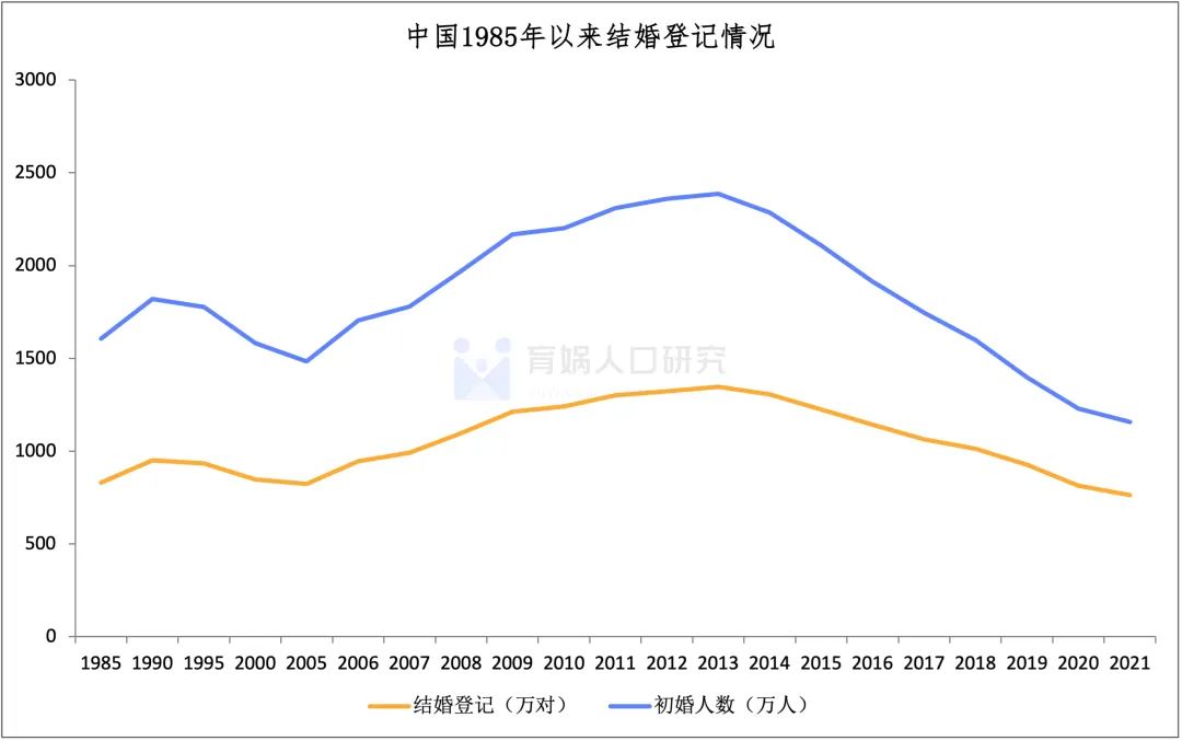 初婚人數(shù)在2013年達到2386萬人的峰值后持續(xù)下降,2021年下降到1158萬人,比2013年下降51.5%。2013年結婚登記對數(shù)為1347萬對,2022年結婚登記對數(shù)下降到683萬對,連續(xù)九年下降。