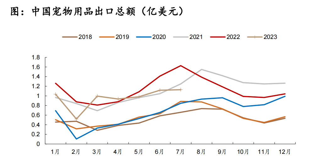 從寵物用品出口數(shù)據(jù)來看,目前我國寵物用品出口正在從底部回暖。2023年7月中國寵物用品以美元口徑計算出口總額為1.13億美元,同比減少30.64%,環(huán)比增長1.13%。