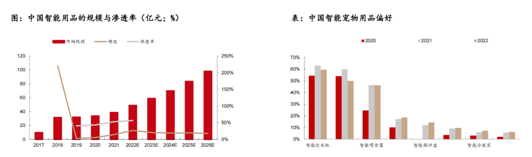 一是智能化:數(shù)據(jù)顯示,2017-2021年中國寵物用品市場規(guī)模分別為9.8、31.4、32.1、33.8、38.6億元,2017-2019年CAGR高達40.9%,預(yù)計到2026年,寵物智能用品有望達到98.1億元。