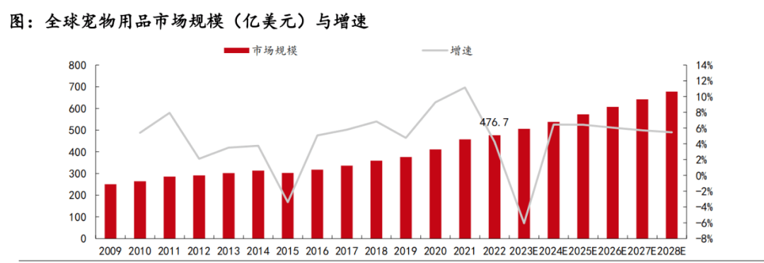 根據(jù)歐睿國際數(shù)據(jù)顯示,2019-2021年寵物用品市場增速分別為4.76%、9.28%、11.16%。2022年增速有所放緩,僅為4.28%,全球?qū)櫸镉闷芬?guī)模達477.68億美元,2019-2022年復(fù)合增長率為8.20%,預(yù)計2022-2028年寵物用品復(fù)合年均增長率為3.03%,寵物用品市場規(guī)模將達到677.25億美元。
