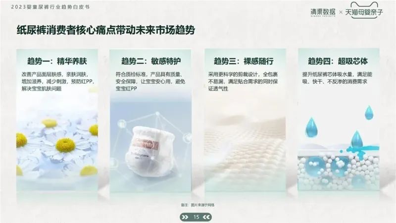 為解決6月齡內新生兒的紅屁屁問題;1歲齡左右寶寶的側漏后漏問題;以及隨著寶寶年齡增長,對紙尿褲吸水量需求變大、紙尿褲表層潮濕等問題,有超過50%的消費者表示,愿意為產(chǎn)品的特殊功能和成分升級支付更多費用。延伸出了精華養(yǎng)膚、敏感特護、裸感隨行、超吸芯體四大趨勢。