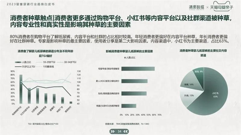 根據(jù)白皮書數(shù)據(jù)統(tǒng)計,80%消費者在購物平臺了解紙尿褲,內容平臺和社群的占比相對較高。年輕消費者更偏好在內容平臺種草,年長消費者更偏好在社群種草。專家是影響種草的最主要因素,使用者分享是第二大影響因素。內容渠道中,小紅書為主要渠道,占比63%。