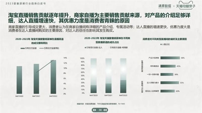 不僅如此,像淘寶等購買平臺,通過直播銷售所貢獻的購買量也在逐步上升:商家直播的引導成交更大,消費者認為在商家自播間有詳細的產(chǎn)品介紹、專屬活動等;達人直播的增速更快,優(yōu)惠力度大是消費者在達人直播間購買的主要原因,對達人的信任也影響其發(fā)生購買。