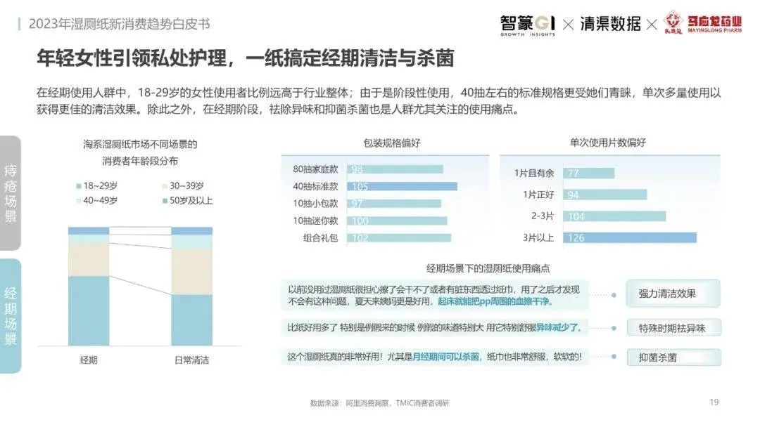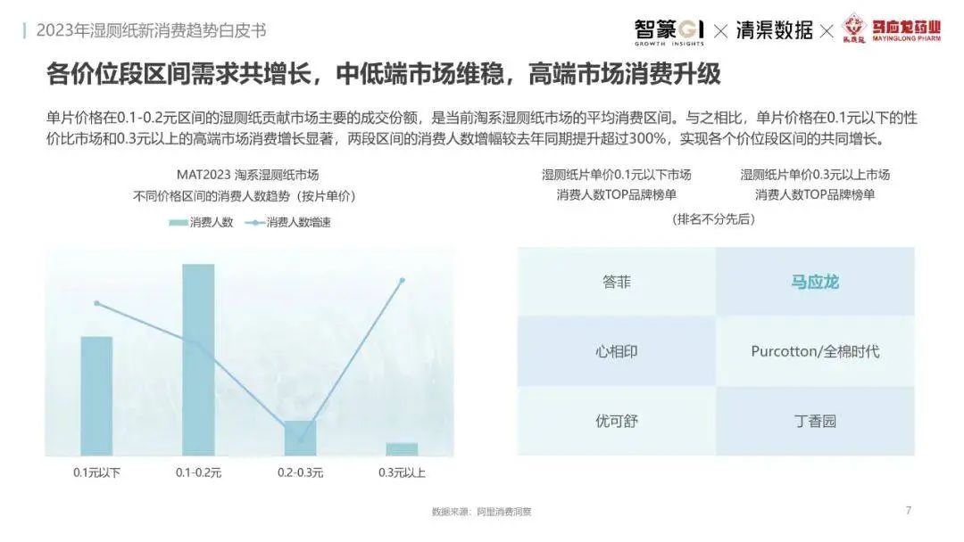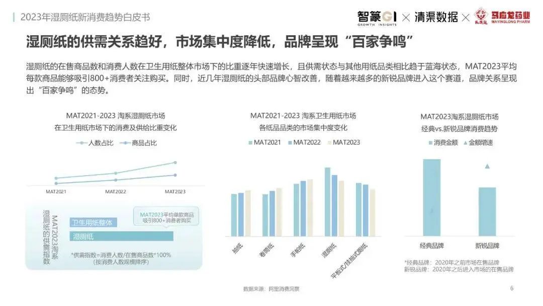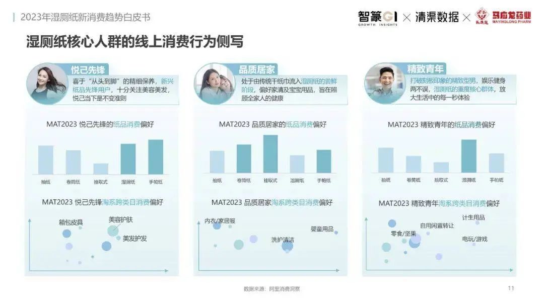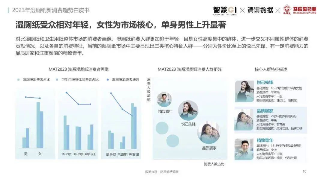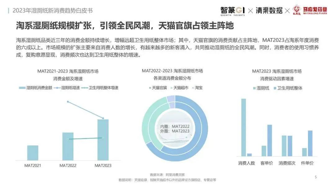 淘系濕廁紙品類近三年的消費金額持續(xù)增長,增幅遠超衛(wèi)生用紙整體市場,其中,天貓官旗的消費責獻占主陣地,MAT2023占淘系年度消費的六成以上,市場規(guī)模的擴張主要來自消費人數(shù)的增長,有越來越多的新客涌入,共同推動溫廁紙的全民風潮,同時,消費者的使用習慣養(yǎng)成,復購意愿顯現(xiàn),消費頻次也達到衛(wèi)生用紙整體的增速。