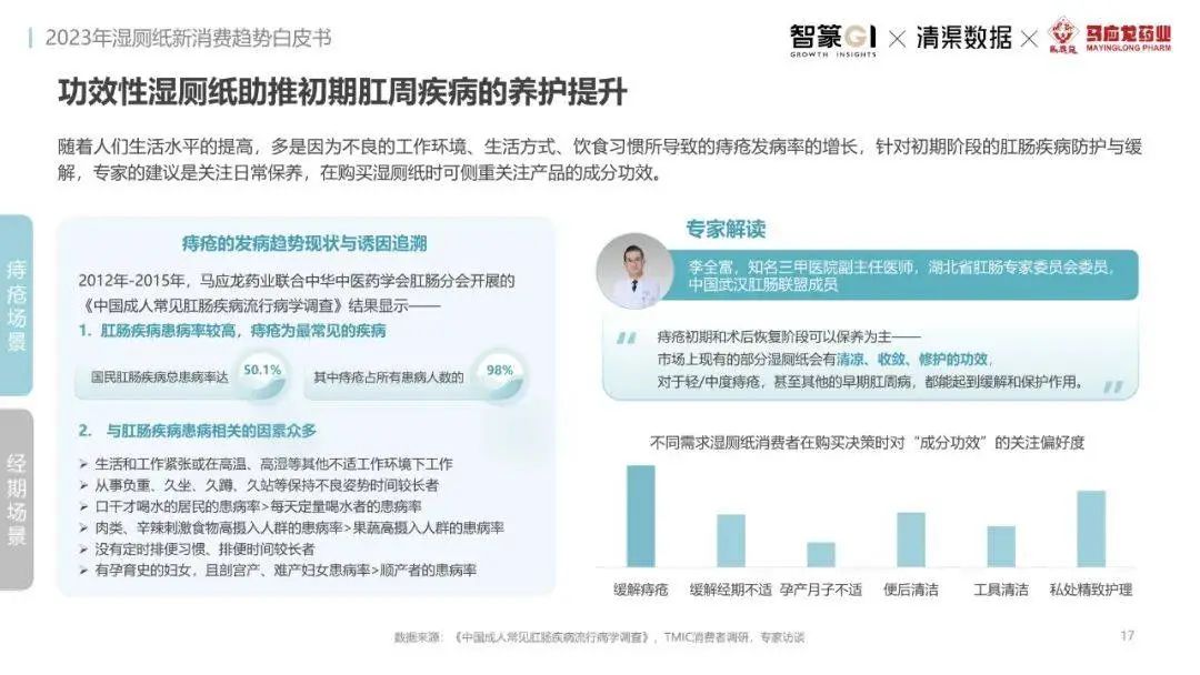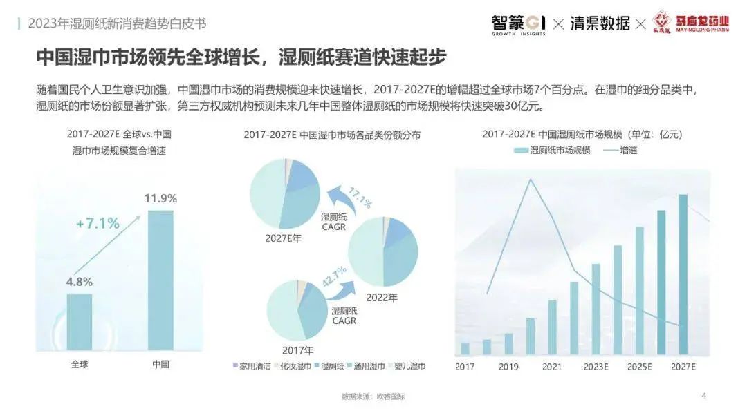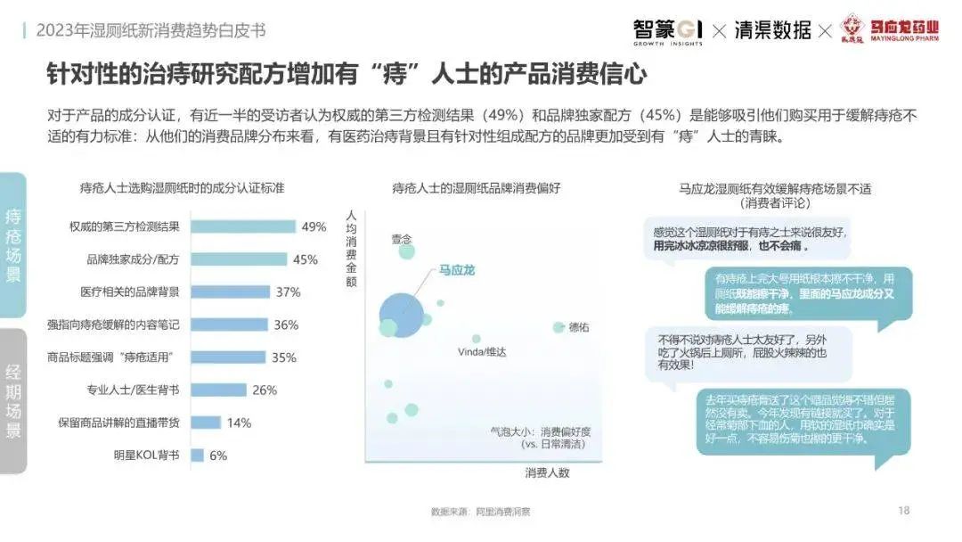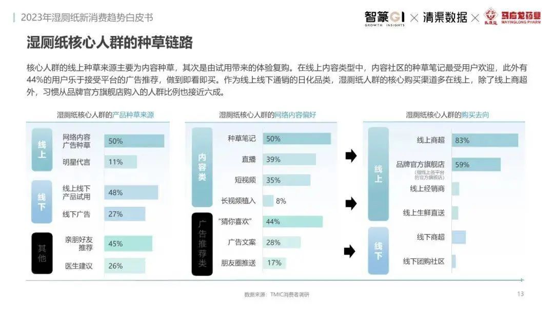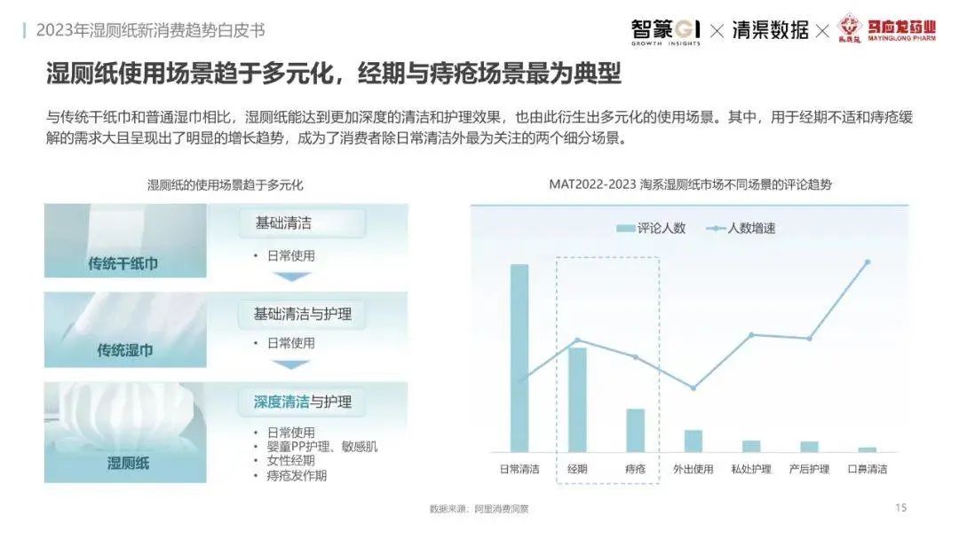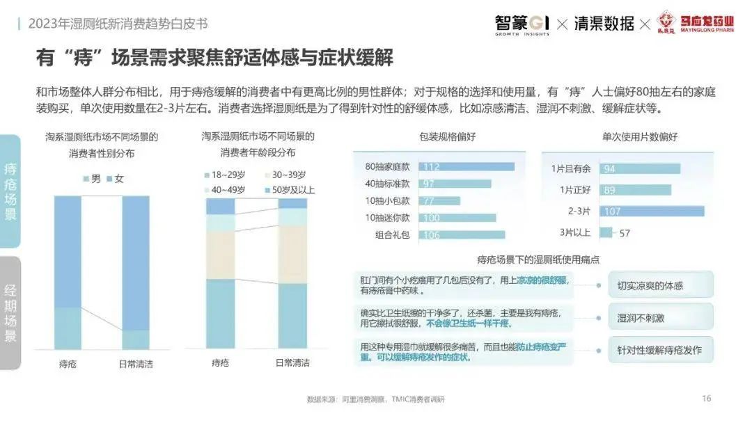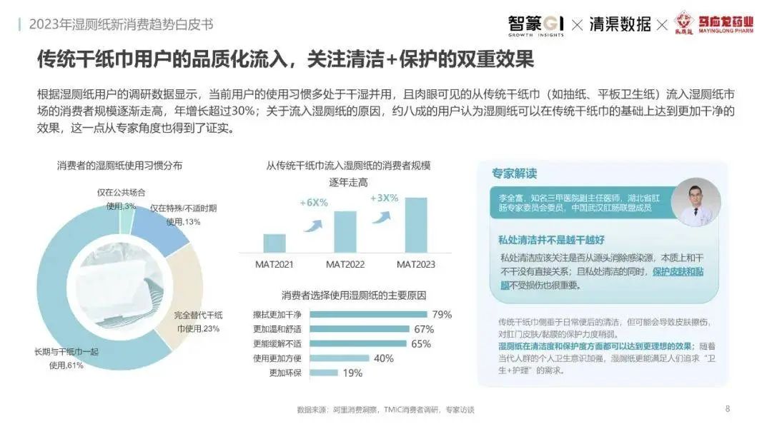 淘系濕廁紙品類近三年的消費金額持續(xù)增長,增幅遠超衛(wèi)生用紙整體市場,其中,天貓官旗的消費責獻占主陣地,MAT2023占淘系年度消費的六成以上,市場規(guī)模的擴張主要來自消費人數(shù)的增長,有越來越多的新客涌入,共同推動溫廁紙的全民風潮,同時,消費者的使用習慣養(yǎng)成,復購意愿顯現(xiàn),消費頻次也達到衛(wèi)生用紙整體的增速。