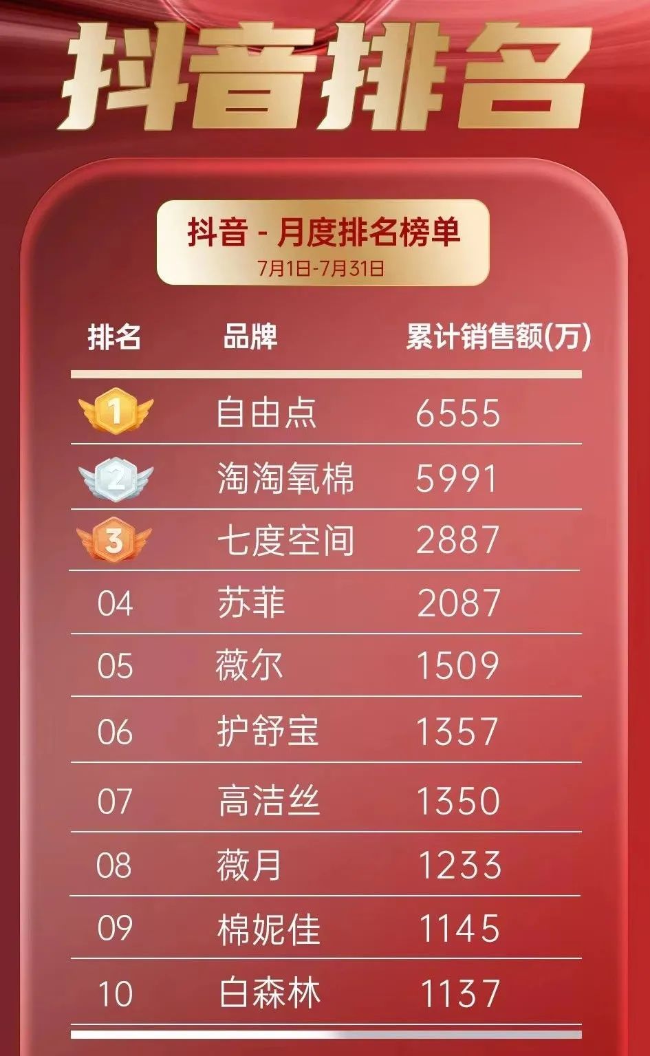 根據(jù)第三方數(shù)據(jù)平臺顯示,抖音平臺2024年7月份衛(wèi)生巾前十銷售榜單,其中,“自由點(diǎn)”品牌以6555萬元的銷售額高居榜首,展現(xiàn)出了強(qiáng)大的市場號召力和消費(fèi)者認(rèn)可度。