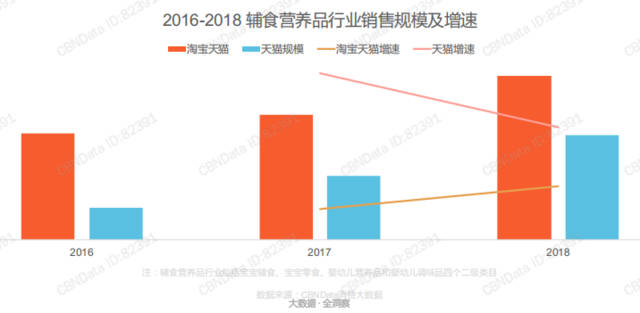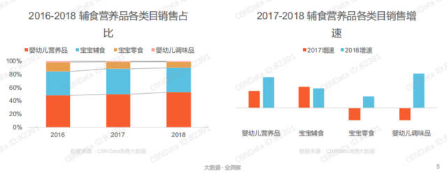 目前輔食營(yíng)養(yǎng)品大致分為嬰幼兒營(yíng)養(yǎng)品、寶寶輔食、寶寶零食、嬰幼兒調(diào)味品四個(gè)子品類(lèi)。從上圖我們不難看出,從2016年—2018年嬰幼兒營(yíng)養(yǎng)品從不足50%提升至50%以上,銷(xiāo)售占比逐年提升,發(fā)展態(tài)勢(shì)一片大好。一方面,“生命早期1000天營(yíng)養(yǎng)健康”在政府層面的確立,更是為嬰兒營(yíng)養(yǎng)品打開(kāi)了市場(chǎng)的大門(mén);另一方面,在優(yōu)生優(yōu)育觀(guān)念的影響下,孕育下一代成為每個(gè)家庭的頭等大事,嬰幼兒營(yíng)養(yǎng)品的市場(chǎng)占比與熱度日益提升。