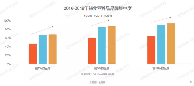一直以來(lái),嬰幼兒輔食營(yíng)養(yǎng)品行業(yè)市場(chǎng)集中度都較高,頭部效應(yīng)比較凸顯。從上圖可以看出,2016年輔食營(yíng)養(yǎng)品前1%的品牌銷(xiāo)售額占比低于半數(shù),發(fā)展至2017-2018年,輔食營(yíng)養(yǎng)品前1%的品牌貢獻(xiàn)了超過(guò)6成以上的銷(xiāo)售額,前5%的品牌貢獻(xiàn)了八成左右的銷(xiāo)售額,前10%的品牌貢獻(xiàn)了接近90%的銷(xiāo)售額,且在逐年增強(qiáng)。品牌集中度持續(xù)趨高,頭部企業(yè)地位難以撼動(dòng)。