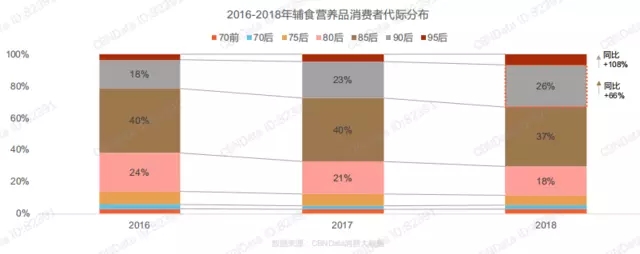隨著90后新生代媽媽的不斷增多,母嬰人群的認(rèn)知水平及消費(fèi)水平大幅提升,她們更愛(ài)愿意為“健康”的生活態(tài)度付費(fèi)。從上圖可以看出,近三年來(lái),85后仍為輔食營(yíng)養(yǎng)品的主要購(gòu)買(mǎi)人群,人數(shù)占比為40%左右,在所有人群中最為強(qiáng)勢(shì);而90/95后作為新生代母嬰消費(fèi)人群異軍突起,消費(fèi)者人數(shù)大幅增長(zhǎng),人數(shù)占比從2016年18%提升至30%以上,其中,90后成為一股新興力量,2018年較2017年增長(zhǎng)66%,有望成為嬰幼兒營(yíng)養(yǎng)品的下一個(gè)主力人群。